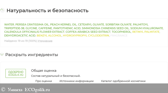 Состав маски просто превосходный. Во-первых, фитостволовые клетки. Во-вторых, водоросли. В-третьих, гиалуроновая кислота. Далее – экстракт голубой водоросли, конский каштан, экстракт зеленого кофе. По действию маска очень напоминает альгинатную, и это действительно так – средство в том числе содержит альгинат натрия. Все растения – в виде CO2 экстрактов, то есть с сохранением всех полезных свойств.