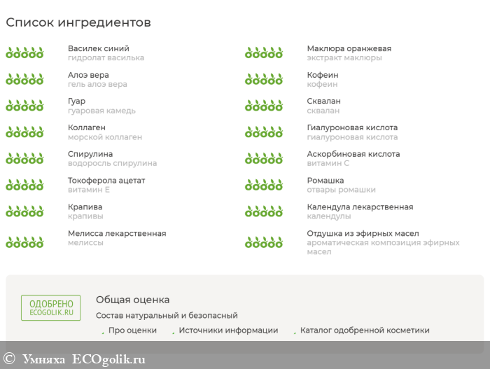 Противоотечный и лифтинг эффект достигается благодаря натуральным компонентам. Это гиалуроновая кислота, кофеин, сквалан, спирулина, витамин Е и другие. Полный состав есть на скрине состава. Отеки быстро пропадают, кожа становится более эластичной.