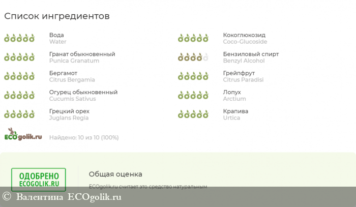 Aqua (Родниковая вода), Coco-Glucoside (Мягкий ПАВ), Punica Granatum Seed Oil* (Масло гранатовой косточки), Benzyl Alcohol (Бензиловый спирт), Citrus Bergamia Oil (Эфирное масло бергамота), Citrus Paradisi Oil (Эфирное масло грейпфрута), Cucumis Sativus L. Extract (Экстракт огурца), Arctium Lappa Extract (Экстракт лопуха), Juglans Regia Leaf Extract (Экстракт грецкого ореха), Urtica Dioica L. Extract (Экстракт крапивы).