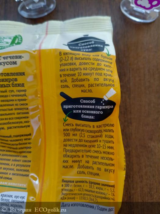 В составе смеси чечевица красная, кус-кус пшеничный, киноя белая, овощная смесь (лук репка, морковь, паприка красная, укроп, петрушка, лук-порей, пастернак корень), свекла сушеная дробленая, лук жаренный, чеснок сушеный дробленый, перец черный молотый. Ну просто палочка-выручалочка для хозяек. И готовится быстро, за 10 минут буквально. Не в пост можно делать на бульоне.