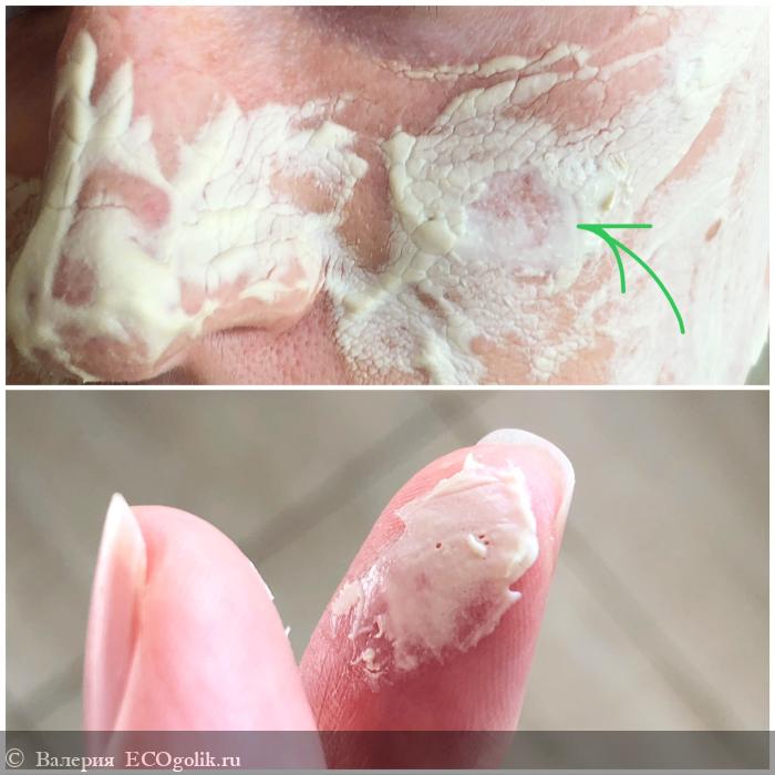 На протяжении всей процедуры кожа ощущает себя комфортно, нет чувства стянутости или жжения. Маска приятно охлаждает кожу и постепенно подсыхает, но только на поверхности. Внутри она все еще кремовая и продолжает работать, поэтому ее не надо дополнительно орошать гидролатом:
