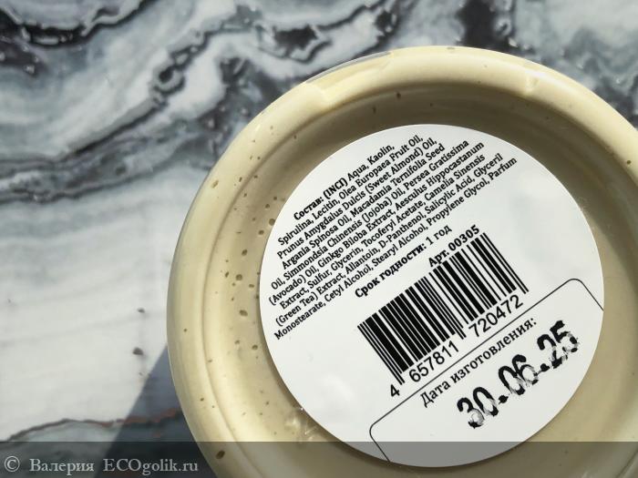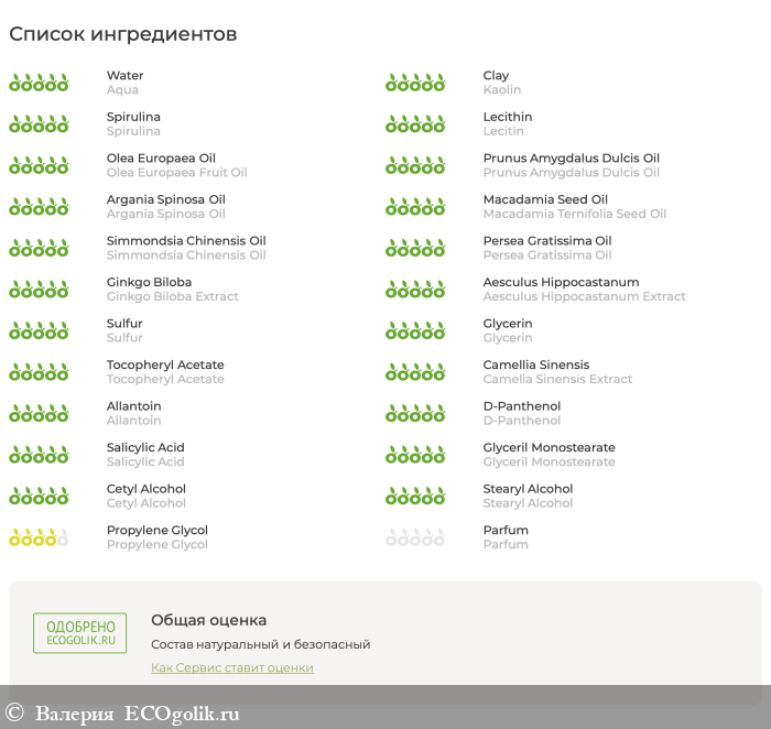 INCI: Aqua, Kaolin, Spirulina, Lecitin, Olea Europaea Fruit Oil, Prunus Amygdalus Dulcis (Sweet Almond) Oil, Argania Spinosa Oil, Macadamia Ternifolia Seed Oil, Simmondsia Chinensis (Jojoba) Oil, Persea Gratissima (Avocado) Oil, Ginkgo Biloba Extract, Aesculus Hippocastanum Extract, Sulfur, Glycerin, Tocopheryl Acetate, Camelia Sinensis (Green Tea) Extract, Allantoin, D-Panthenol, Salicylic Acid, Glyceril Monostearate, Cetyl Alcohol, Stearyl Alcohol, Propylene Glycol, Parfum.