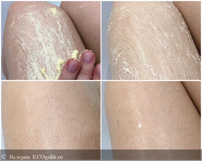 - Сначала я отшелушиваю кожу с помощью скрабирующей части продукта. Распределяю скраб круговыми движениями по всей поверхности тела, тем самым делаю активный тонизирующий массаж буквально пару минут, после чего смываю теплой водой остатки средства;