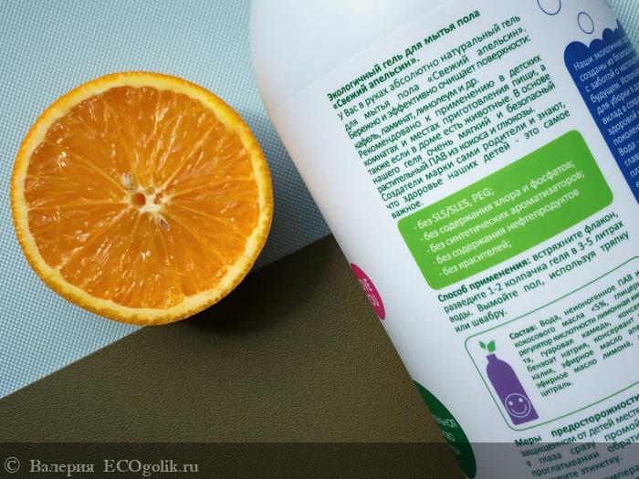 Мне нравится мыть пол с экологичным гелем от Фрешбабл, ведь с ним уборка проходит быстро и эффективно. Радует и то, что средство не имеет едкого запаха и синтетической парфюмерной отдушки - для ароматики используются только натуральные эфирные масла апельсина и лимона - которые уже сами по себе обладают чистящими свойствами: