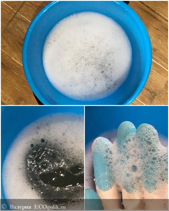 Пена не сходит даже к концу уборки, хотя вода в ведре уже полностью черная от пыли и грязи: