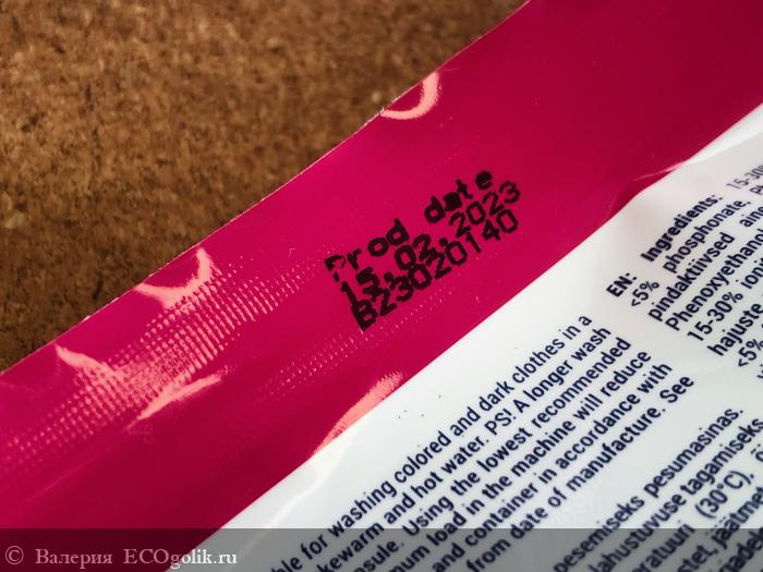 Капсула разделена на три отсека, в ней содержится моющее, пятновыводитель и средство для защиты цвета.