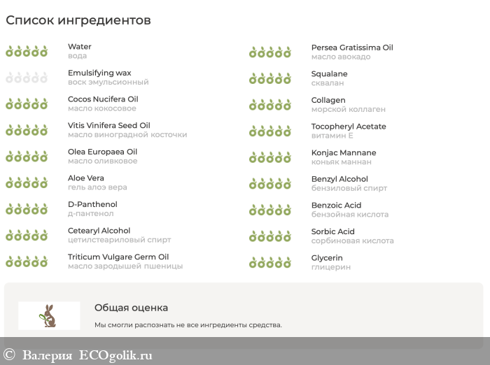 Кролик-Экоголик распознал и одобрил все компоненты в составе, кроме эмульсионного воска, сомневаясь в его происхождении. Для прояснения ситуации всегда можно спросить о товаре или о каком-то конкретном компоненте в составе средства у самого бренда на любой торговой площадке, где представлен продукт, в разделе "вопросы".