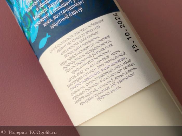 Состав: вода, воск эмульсионный, масло кокосовое, масло виноградной косточки, масло оливковое, гель алоэ вера, д-пантенол, цетилстеариловый спирт, масло зародышей пшеницы, масло авокадо, сквалан, морской коллаген, витамин Е, коньяк маннан, бензиловый спирт, бензойная кислота, сорбиновая кислота, глицерин, натуральная композиция из эфирных масел.