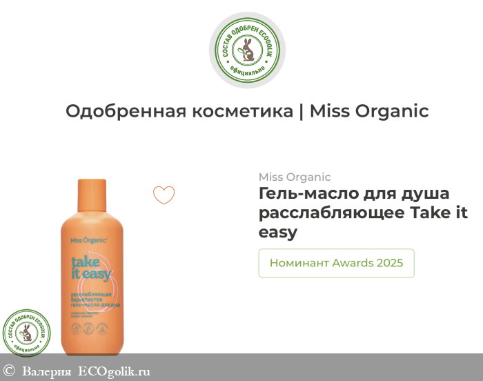 Валерия: Настоящий персиковый релакс и никакой паники в отопительный сезон с бархатистым гель-маслом для душа "Take it easy" от Miss Organic!