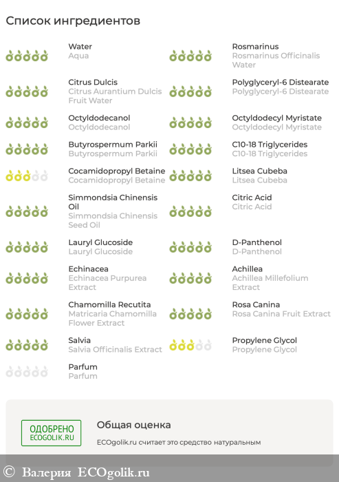 Aqua, Rosmarinus Officinalis (Rosemary) Water, Chamomilla Recutita (Matricaria) Flower Water, Citrus Aurantium Dulcis (Orange) Fruit Water, Polyglyceryl-6 Distearate, Octyldodecanol, Octyldodecyl Myristate, Butyrospermum Parkii, C10-18 Triglycerides, Cocamidopropyl Betaine, Litsea Cubeba Pers Oil, Simmondsia Chinensis Seed Oil, Citric Acid, Lauryl Glucoside, D-Panthenol, Echinacea Purpurea (Purple Coneflower) Extract, Achillea Millefolium (Common Yarrow) Extract, Matricaria Chamomilla Flower Extract, Rosa Canina Fruit Extract, Salvia Officinalis (Sage) Extract, Propylene Glycol, Parfum.