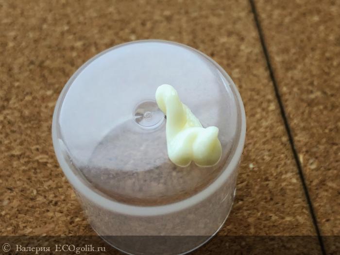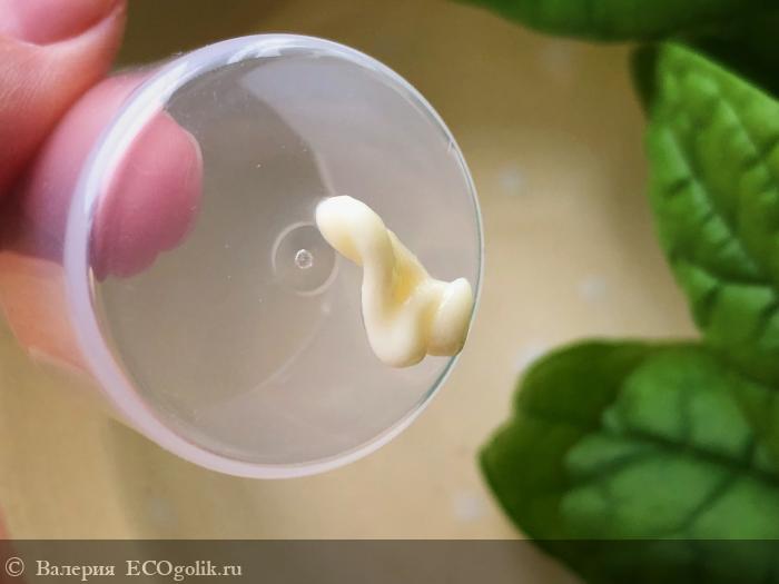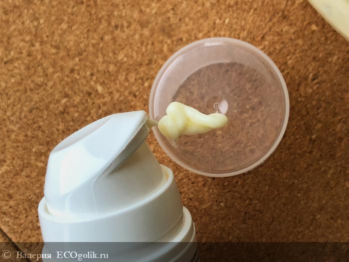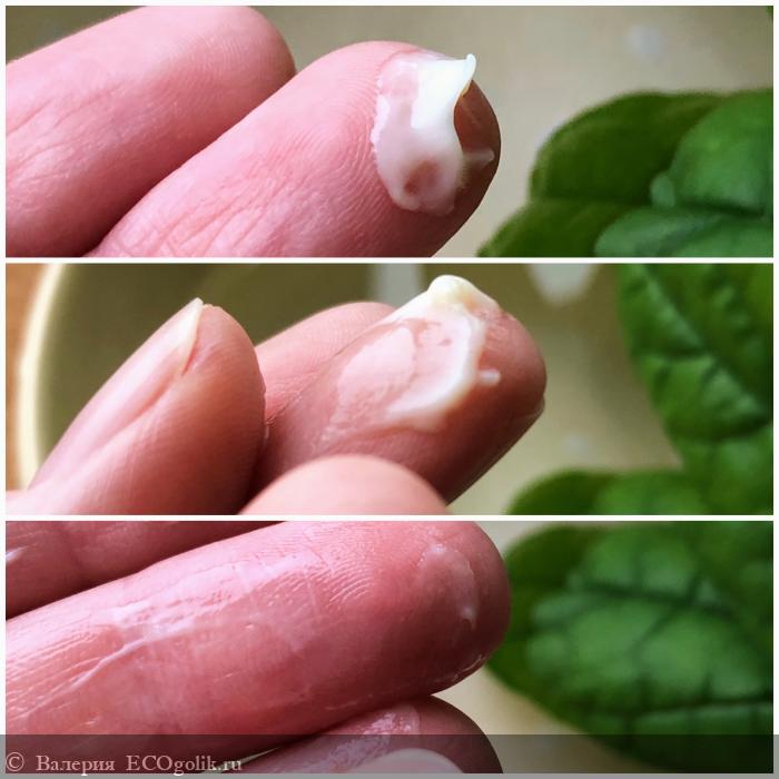У средства довольно плотная кремовая текстура, которая крепко держит форму и нисколько не расходится по поверхности: