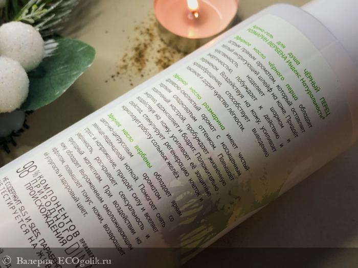 Валерия: Пряный десерт для кожи от Индекса Натуральности: Аромагель для душа с эфирным маслом черного перца, розмарина и вербены.