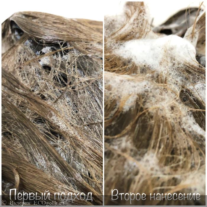 При повторном нанесении буру порцию вдвое меньше предыдущей, т.к. продукт еще легче наносится и заметнее пенится! Могу даже немного дать времени средству все-таки повоздействовать на кожу головы (не более минуты).