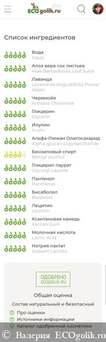 Aqua (вода родниковая), Aloe Barbadensis (Aloe) Leaf Juice (гeль алоэ вера), Lavandula Angustifolia Flower Water (гидролат лаванды), Annona Cherimola Fruit Extract (смесь фруктовых энзимов, экстрагированных из мякоти плодов черимойи), Glycerin (растительный глицерин), Inulin/Alpha-glucan oligosaccharide (инулин, альфа-глюкан олигосахарид), Benzyl alcohol/ Glyceryl Laurate (бензиловый спирт, глицерил лаурат), Panthenol, Bisabolol, Lecithin, Xantan Gum (ксантановая камедь), Lactic Acid (молочная кислота), Sodium Lactate (лактат натрия).