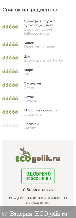 Лаурилсульфосукцинат динатрия, масло какао, масло ши, натуральный молотый кофе, глицерин, бетаин, молочная кислота, пищевой ароматизатор.