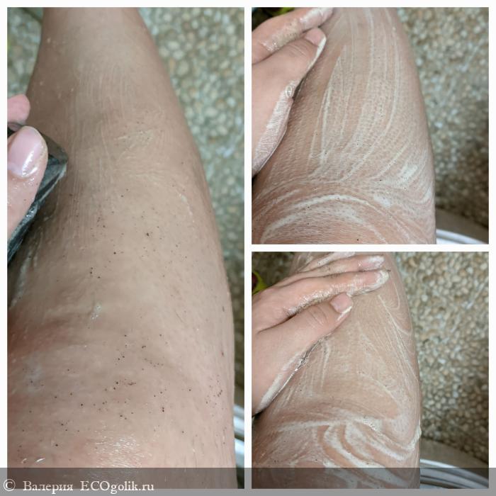Пенка получается нежная, обильная, идет она вперемешку с кофейными частичками. Когда я взбиваю и распределяю ее по телу, то дополнительно еще и легко скрабирую кожу. Кстати, прелесть этого средства в том, что если нужно сильное, жесткое отшелушивание кожи, то нужно просто активно водить твердым скрабом по ней. Если же нужно скрабирование на нежных участках кожи, то нужно намылить средством руки и уже этой пенкой скрабировать их.