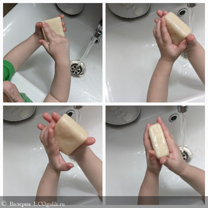 Загрязнения с кожи мыло нежно, но в то же время эффективно убирает. Кожу оно не сушит, аллергию или раздражение не вызвало ни у взрослых, ни у детей.
