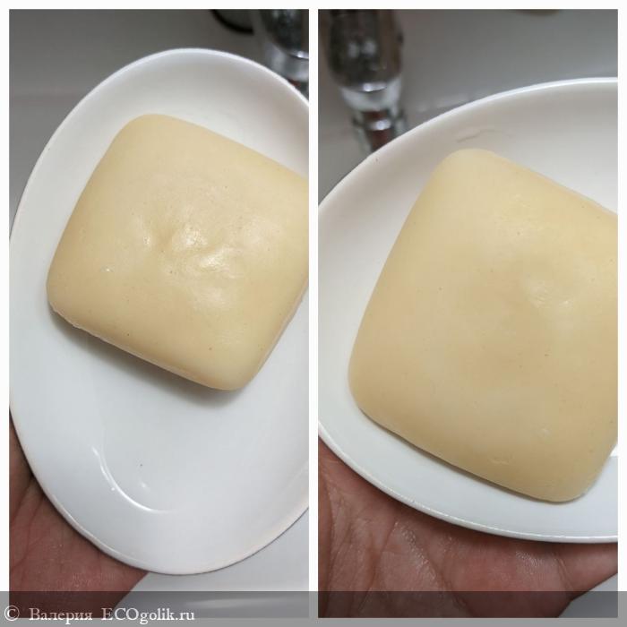 Мыло изготовлено в виде небольшого брусочка квадратной формы, края у него не такие ровные как у фабричного. Оно твердое, непористое, однородное, без каких-либо вкраплений, соломенно-желтого цвета.