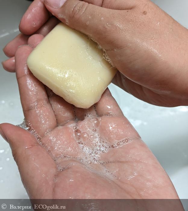 Я почему-то ожидала, что у мыла будет свежий, сладко-фруктовый, апельсиновый аромат. Но оно вообще без каких-либо отдушек. Запах конечно у нет есть, но он какой-то совсем натуральный, советское детское мыло без отдушек очень похоже пахло.