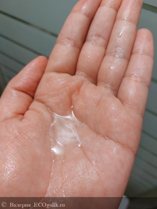 Гель не слишком густой, но и как вода не растекается, прозрачный, совсем немного мутноват, без каких-либо вкраплений и/или добавок.