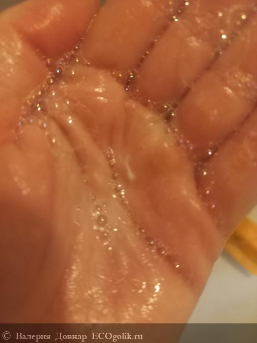 Пенится шампунь хорошо - и в ладонях, и еще лучше - если просто потереть брусочком о мокрые волосы.