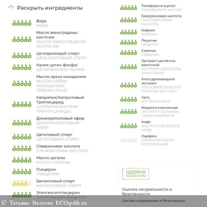 ВОДА, МАСЛО ВИНОГРАДНОЙ КОСТОЧКИ, ЦЕТЕАРИЛОВЫЙ СПИРТ, ЦЕТИЛФОСФАТ КАЛИЯ, МАСЛО ОРЕХА МАКАДАМИИ ТРЁХЛИСТНОЙ, КАПРИЛИК/КАПРИК ТРИГЛИЦЕРИДЫ, ДИКАПРИЛИЛОВЫЙ ЭФИР, ЦЕТИЛОВЫЙ СПИРТ, СТЕАРИНОВАЯ КИСЛОТА, МАСЛО АРГАНЫ, ГЛИЦЕРИН, БЕНЗИЛОВЫЙ СПИРТ, ЭТИЛГЕКСИЛГЛИЦЕРИН, ТОКОФЕРОЛА АЦЕТАТ (ВИТАМИН Е), ГИАЛУРОНОВАЯ КИСЛОТА, КОФЕИН, ЛЕЦИТИН, СКВАЛАН, ЭКСТРАКТ ЦЕНТЕЛЛЫ АЗИАТСКОЙ, АЛОЭ ДРЕВОВИДНОЕ ЛИСТЬЕВ ЭКСТРАКТ, ЭКСТРАКТ ЧАГИ, ЭКСТРАКТ ЦЕЛЬНЫХ СЕМЯН МОРИНГИ, ЭКСТРАКТ ЗЕЛЕНОГО КОФЕ, АРОМАТИЧЕСКАЯ КОМПОЗИЦИЯ.