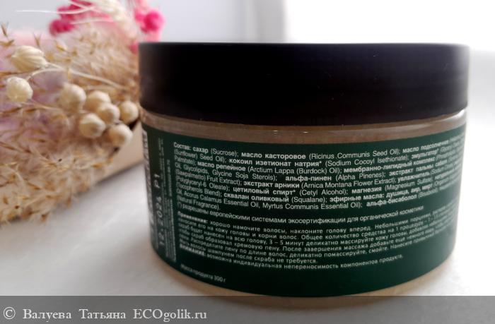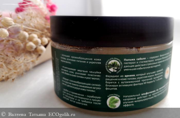 - Комплекс активных компонентов, таких как экстракты пальмы сабаля и арники, дополняет формулу скраба;