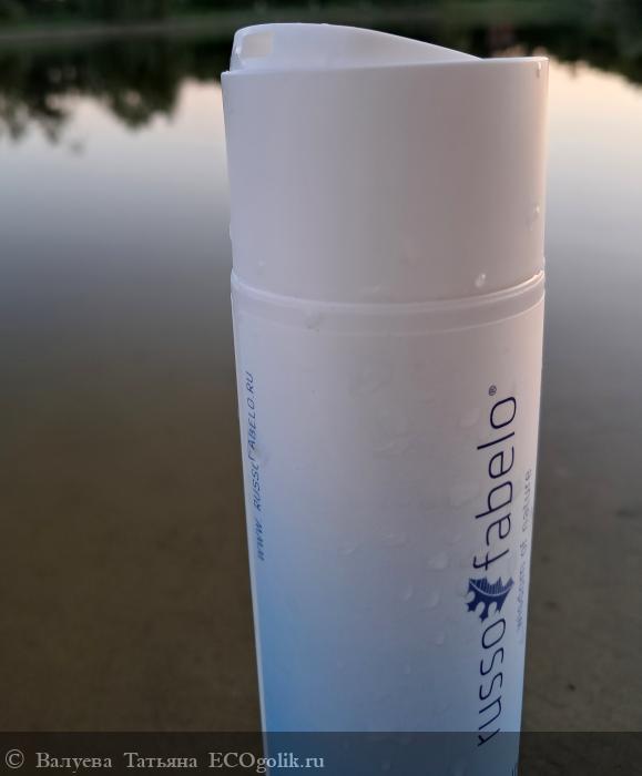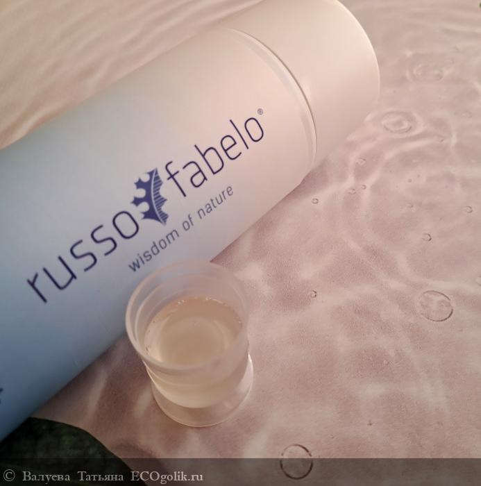 Дизайн передней части флакона отличается простотой и лаконичностью: крупная надпись "Russo Fabelo" подчёркивает бренд производителя, а чуть ниже расположено чёткое обозначение самого продукта, которое легко читается и запоминается. Такая продуманная композиция позволяет быстро ориентироваться среди множества косметических средств.