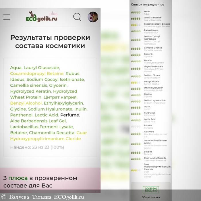 Aqua, Lauryl Glucoside, Cocamidopropyl Betaine, Rubus Idaeus fruit wate, Sodium Cocoyl Isethionate , Camellia sinensis leaf water, Glycerin, Hydrolyzed Keratin, Hydrolyzed Wheat Protein, Sodium Сitrate , Benzyl Alcohol, Ethylhexylglycerin, Glycine,Sodium Hyaluronate, Inulin, Panthenol, Lactic Acid, Perfume, Aloe Barbadensis (Aloe Vera) Leaf Gel, Lactobacillus Ferment Lysate, Betaine, Chamomilla Recutita Flower Exctract, Guar Hydroxypropyltrimonium Cloride