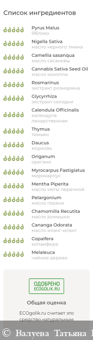 Pyrus Malus seed oil (растительное масло яблочных семян), Nigella sativa seed oil (растительное масло семян черного тмина), Camellia sasanqua oil (растительное масло сасанквы), Cannabis sativa seed oil (растительное масло семян конопли), Rosmarinus officinalis CO2 – extract (СО2 – экстракт розмарина лекарственного), Glycyrrhiza glabra CO2 – extract (СО2 – экстракт солодки голой), Calendula officinalis CO2 – extract (СО2 – экстракт календулы лекарственной), Thymus satureioides essential oil (эфирное масло тимьяна марокканского), Daucus carota essential oil (эфирное масло семян моркови), Origanum heracleoticum essential oil (эфирное масло орегано греческого), Myrocarpus fastigiatus essential oil (эфирное масло мирокарпуса), Mentha piperita essential oil (эфирное масло мяты перечной), Pelargonium x asperum essential oil (эфирное масло герани), Сhamaemelum nobile essential oil (эфирное масло ромашки римской), Cananga odorata essential oil (эфирное масло иланг – иланга), Copaifera officinalis essential oil (эфирное масло копаиферы), Melaleuca alternifolia essential oil (эфирное масло чайного дерева)
