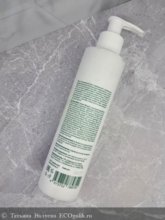 Надписи на флаконе выполнены в чётком и легко читаемом шрифте, что делает информацию доступной и понятной. Упоминание о том, что гель подходит для умывания и снятия макияжа, подчёркивает его универсальность и удобство использования