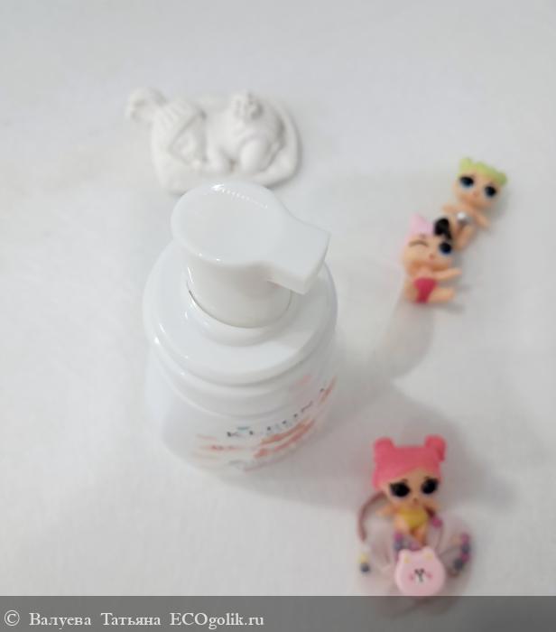Помповый дозатор плотно закрывается, предотвращая случайное открытие и вытекание содержимого. Пенообразователь работает мягко и эффективно, образуя нежную пену, подходящую для чувствительной кожи ребёнка.