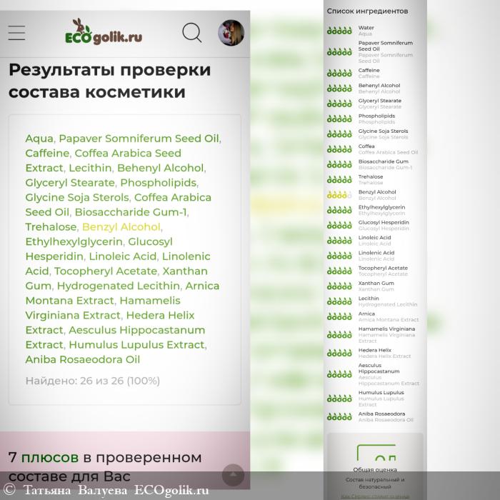 Aqua, Papaver Somniferum Seed (мака семян) Oil, Caffeine (and) Coffea Arabica Seed Extract (and) Lecithin, Behenyl Alcohol (and) Glyceryl Stearate (and) Phospholipids (and) Glycine Soja Sterols, Coffea Arabica Seed (кофе) Oil, Biosaccharide Gum-1, Trehalose, Benzyl Alcohol (and) Ethylhexylglycerin, Glucosyl Hesperidin (геспередин), Linoleic Acid (and) Linolenic Acid, Tocopheryl Acetate, Xanthan Gum, Hydrogenated Lecithin, Arnica Montana (арники) Extract, Hamamelis Virginiana (гамамелиса) Extract, Hedera Helix (плюща) Extract, Aesculus Hippocastanum (конского каштана) Extract, Humulus Lupulus (хмеля) Extract, Aniba Rosaeodora Oil (эфирное масло розового дерева)