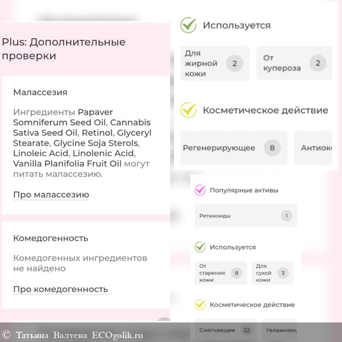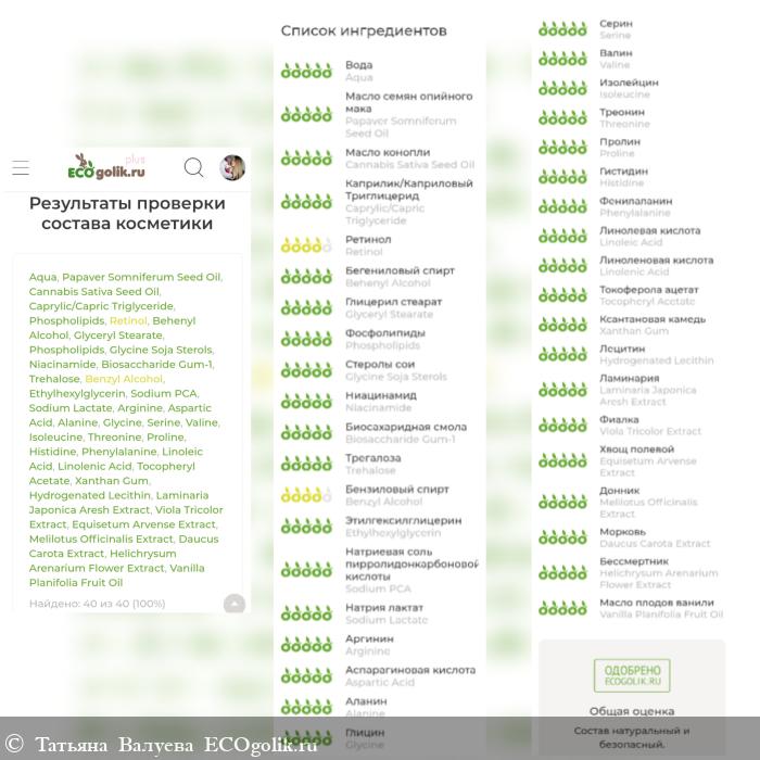 Aqua, Papaver Somniferum Seed (мака семян) Oil, Cannabis Sativa Seed (конопляное) Oil, Caprylic/Capric Triglyceride (and) Phospholipids (and) Retinol (ретинол 0,5%), Behenyl Alcohol (and) Glyceryl Stearate (and) Phospholipids (and) Glycine Soja Sterols, Niacinamide, Biosaccharide Gum-1, Trehalose, Benzyl Alcohol (and) Ethylhexylglycerin, Sodium PCA (and) Sodium Lactate (and) Arginine (and) Aspartic Acid (and) Alanine (and) Glycine (and) Serine (and) Valine (and) Isoleucine (and) Threonine (and) Proline (and) Histidine (and) Phenylalanine, Linoleic Acid (and) Linolenic Acid, Tocopheryl Acetate, Xanthan Gum, Hydrogenated Lecithin, Laminaria Japonica Aresh (ламинарии) Extract, Viola Tricolor (фиалки) Extract, Equisetum Arvense (хвоща) Extract, Melilotus Officinalis (донника) Extract, Daucus Carota (семян моркови) Extract, Helichrysum Arenarium Flower (бессмертника) Extract, Vanilla Planifolia Fruit (ванили) Oil.
