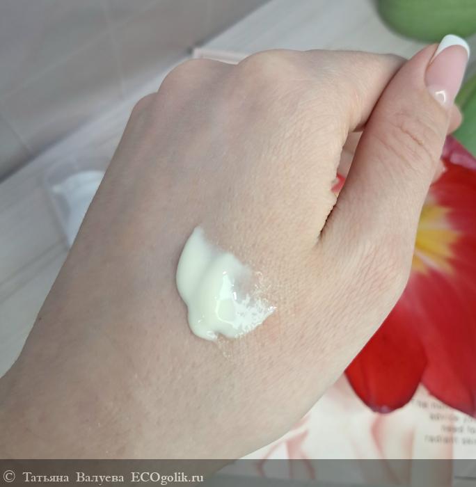 Крем обладает лёгкой текстурой, которая идеально ложится на кожу, не оставляя ощущения тяжести или жирности. Его консистенция средней густоты позволяет легко распределять средство по лицу, обеспечивая равномерное нанесение. Благодаря этому, кожа мгновенно ощущает нежность и заботу, а крем словно растворяется, проникая в самые глубокие слои эпидермиса