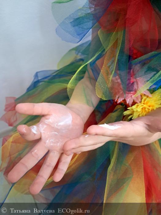Крем быстро впитывается, не оставляя следов на одежде или коже, что обеспечивает комфорт при использовании.