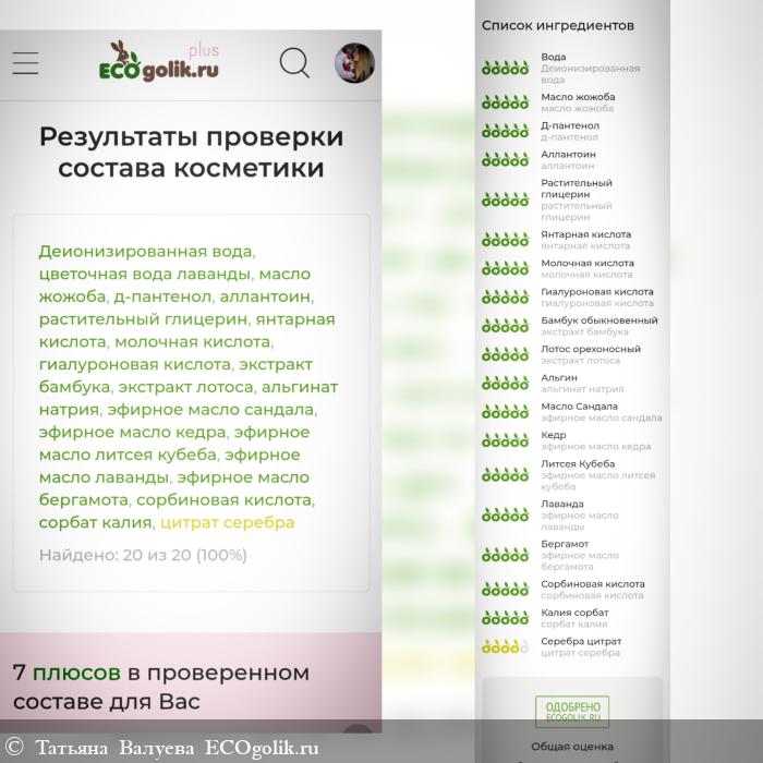 Деионизированная вода, цветочная вода лаванды, масло жожоба, д-пантенол, аллантоин, растительный глицерин, янтарная кислота, молочная кислота, гиалуроновая кислота, экстракт бамбука, экстракт лотоса, альгинат натрия, эфирное масло сандала, эфирное масло кедра, эфирное масло литсея кубеба, эфирное масло лаванды, эфирное масло бергамота, сорбиновая кислота, сорбат калия, цитрат серебра