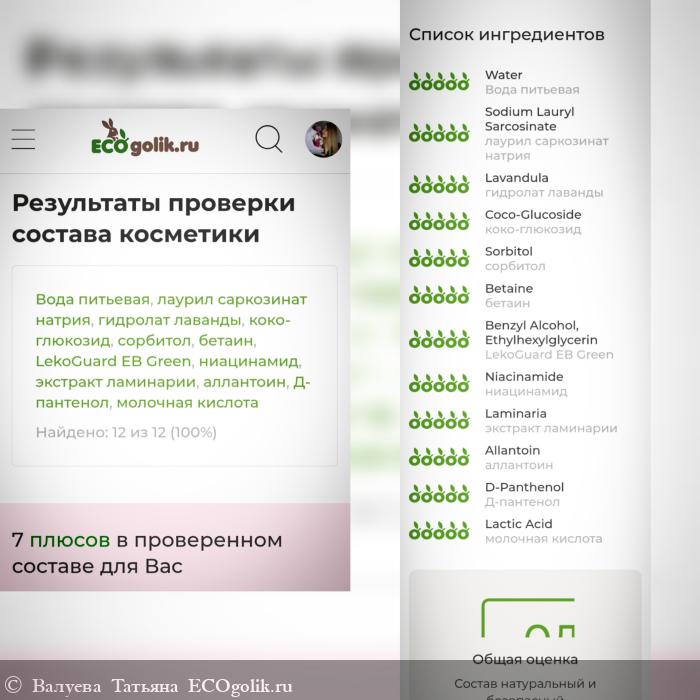 Вода питьевая, лаурил саркозинат натрия, гидролат лаванды, коко-глюкозид, сорбитол, бетаин, LekoGuard EB Green, ниацинамид, экстракт ламинарии, аллантоин, Д-пантенол, молочная кислота.