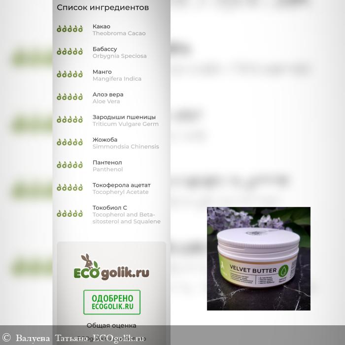 Моя оценка данному продукту 5+ Я считаю, что Масло-баттер для тела VELVET BUTTER natural от бренда Julirea с таким богатым и эффективным составом - это настоящий подарок для кожи. Он не только увлажняет и питает, но и защищает её от негативного воздействия окружающей среды, делая кожу здоровой и сияющей. Я благодарна производителям за такой замечательный продукт и с уверенностью могу сказать, что он заслуживает самых лестных отзывов!!!