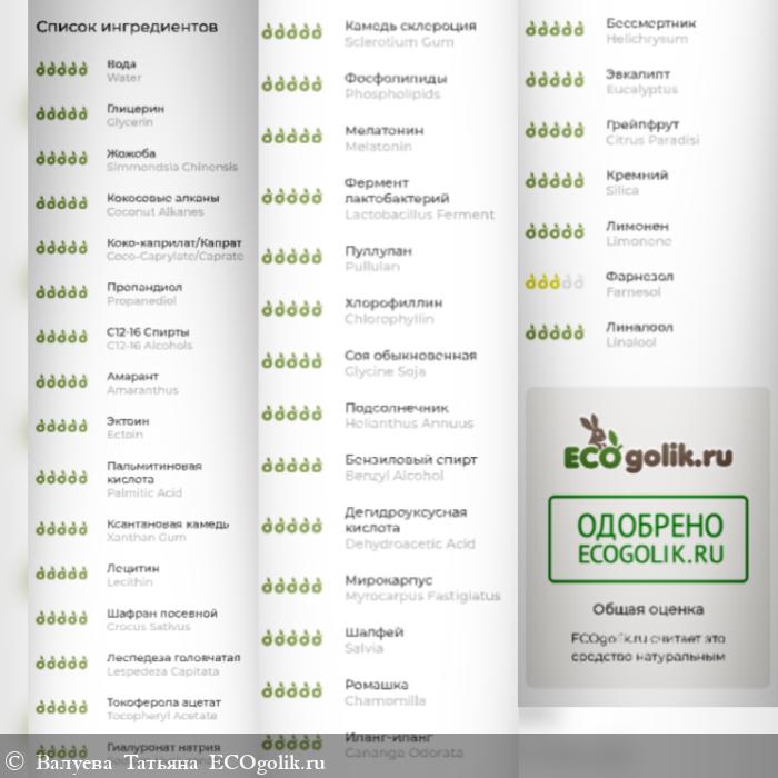 Состав: Water, Glycerin*, Simmondsia Chinensis (Jojoba) Seed Oil*, C15-19 Alkane*, Coco-Caprylate/Caprate*, Propanediol*, C12-16 Alcohols*, Amaranthus Retroflexus Extract*, Ectoin*, Palmitic Acid*, Hydrogenated Lecithin*, Xanthan Gum*, Lecithin*, Crocus Sativus Meristem Cell Extract*, Lespedeza Capitata Leaf/Stem Extract*, Tocopherol*, Sodium Hyaluronate*, Sclerotium Gum*, Phospholipids*, Melatonin*, Lactobacillus Ferment*, Pullulan*, Chlorophyll*, Glycine Soja (Soybean) Oil*, Helianthus Annuus (Sunflower) Seed Oil*, Benzyl Alcohol, Dehydroacetic Acid, Myrocarpus Fastigiatus Wood Essential Oil*, Salvia Sclarea Seed Essential Oil*, Chamaemelum Nobile Essential Oil*, Cananga Odorata Essential Oil*, Helichrysum Italicum Essential Oil*, Eucalyptus Dives Essential Oil*, Citrus Paradisi Essential Oil*, Silica, Limonene**, Farnesol**, Linalool**.
