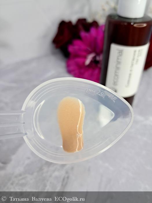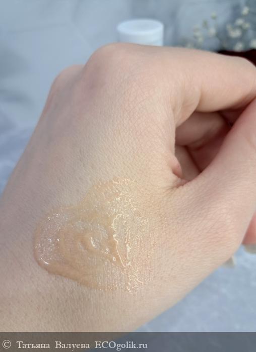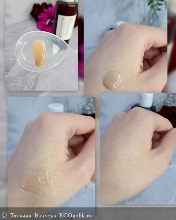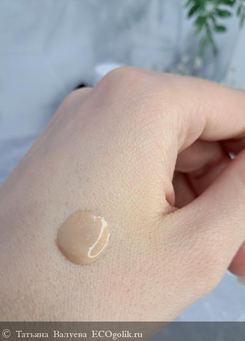 Цвет флюида варьируется от светло-коричневого до янтарного, что придаёт продукту натуральный и теплый оттенок. Консистенция лёгкая и полупрозрачная, напоминает масло, но при этом достаточно жидкая, чтобы легко распределяться по коже.