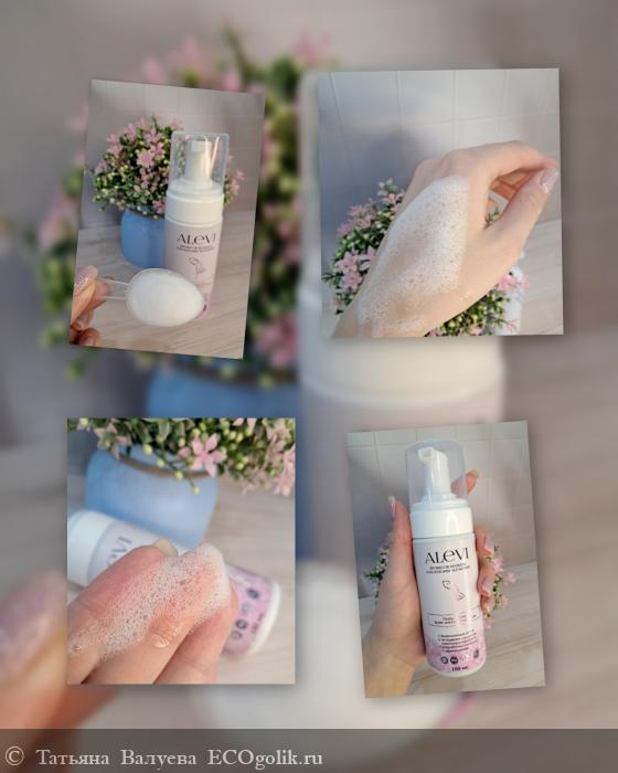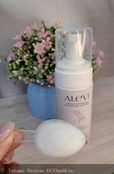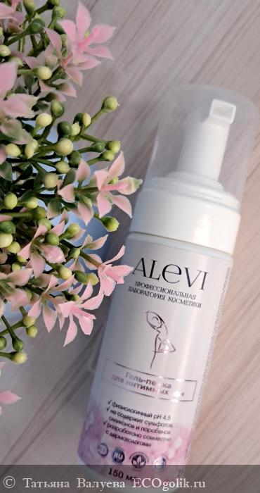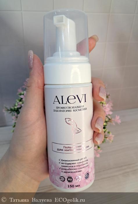 "ALEVI" написано крупным шрифтом, что делает его легко читаемым. Шрифт современный и стильный. "Профессиональная лаборатория косметики" и "Гель-пенка для интимных зон" написаны меньшим шрифтом, но также легко читаются. Это подчёркивает профессиональный подход к созданию продукта.