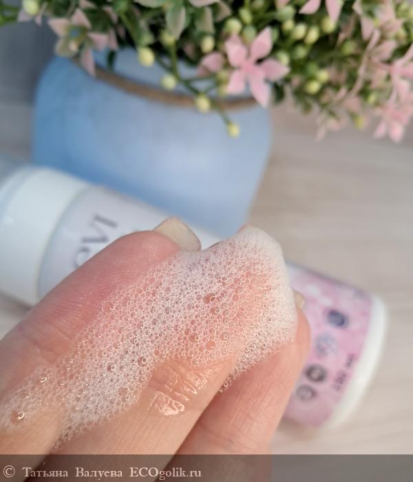 Пенка имеет белый цвет, что ассоциируется с чистотой и свежестью. Консистенция пенки воздушная и мягкая, приятная на ощупь.
