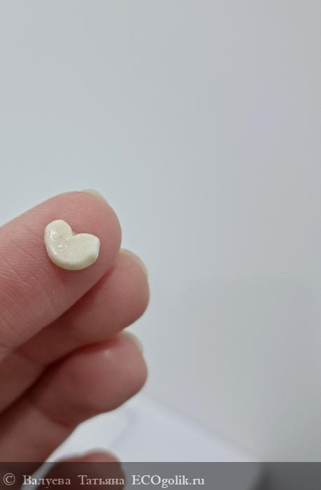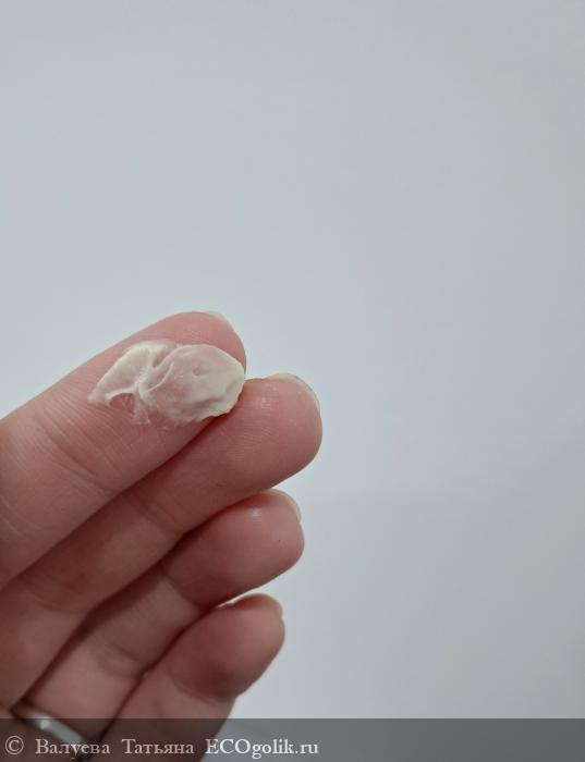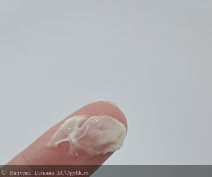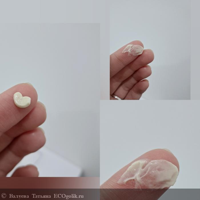Текстура маски обладает средней густотой и плотноватой консистенцией. При тактильном контакте ощущается умеренная насыщенность, что позволяет средству равномерно распределяться по поверхности кожи без нежелательного растекания. Цвет консистенции - белый, что визуально свидетельствует об отсутствии в составе красящих пигментов и потенциальных аллергенов.