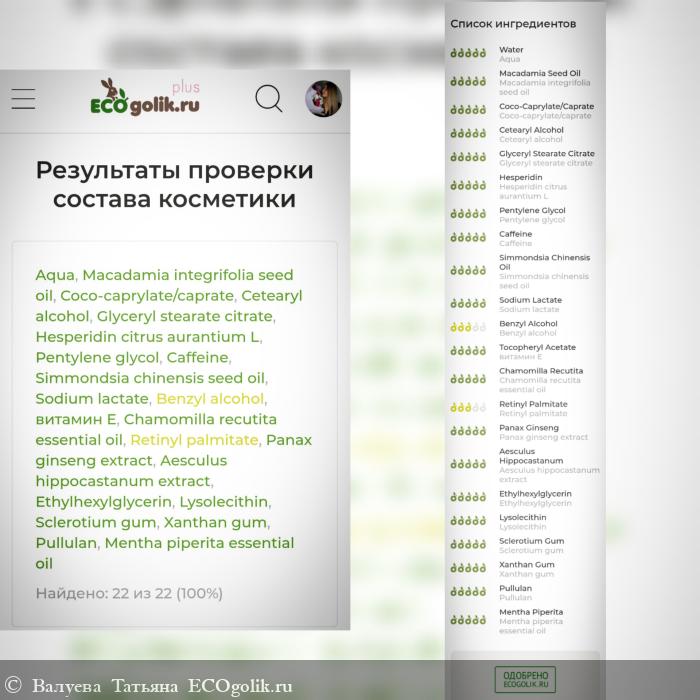 Aqua (вода дистиллированная), Macadamia integrifolia seed oil (масло макадамии), Coco-caprylate/caprate (коко-каприлат/капрат), Cetearyl alcohol (цетилстеариловый спирт), Glyceryl stearate citrate (глицерил стеарат цитрат), Hesperidin citrus aurantium L. (гесперидин), Pentylene glycol* (пентилен гликоль), Caffeine (кофеин), Simmondsia chinensis (jojoba) seed oil (масло жожоба), Sodium lactate (лактат натрия), Benzyl alcohol (бензиловый спирт), Tocopheryl аcetate (витамин Е), Chamomilla recutita essential oil (эфирное масло ромашки), Retinyl palmitate (витамин А), Panax ginseng extract (экстракт женьшеня), Aesculus hippocastanum extract (экстракт каштана), Ethylhexylglycerin (этилгексилглицерин), Lysolecithin (лизолецитин), Sclerotium gum (камедь склероция), Xanthan gum (ксантановая камедь), Pullulan (пуллулан), Mentha piperita essential oil (эфирное масло мяты). *изготовлен из багассы, получаемой из сахарного тростника.