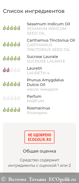 Состав не одобрен сайтом ECOGOLIK.RU, т.к. имеет один нежелательный ингридиент.