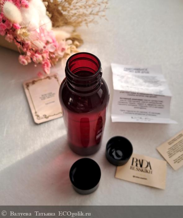 Флакон гидрофильного масла для душа от RADA RUSSKIKH - это первое, что бросается в глаза. У меня версия объёмом 100 мл., и он выполнен из темно-красного пластика. Цвет насыщенный, глубокий, сразу привлекает внимание. Мне нравится минимализм в оформлении: на самом флаконе минимум информации, только самое необходимое, и всё это белым шрифтом. Выглядит стильно и лаконично