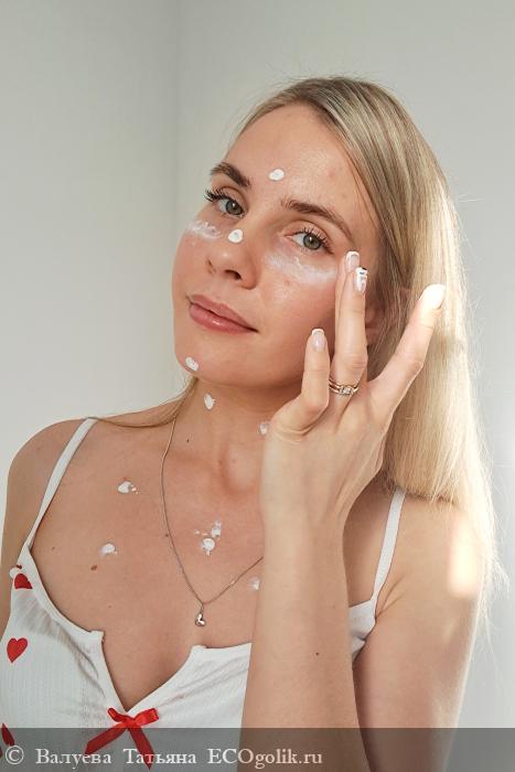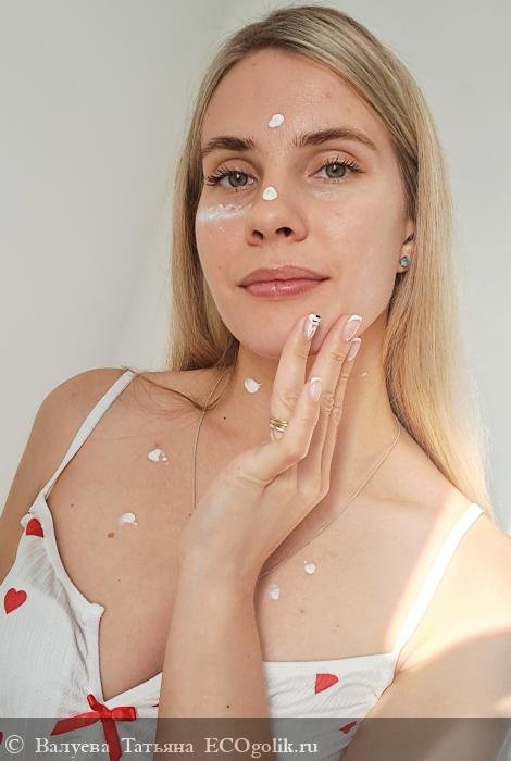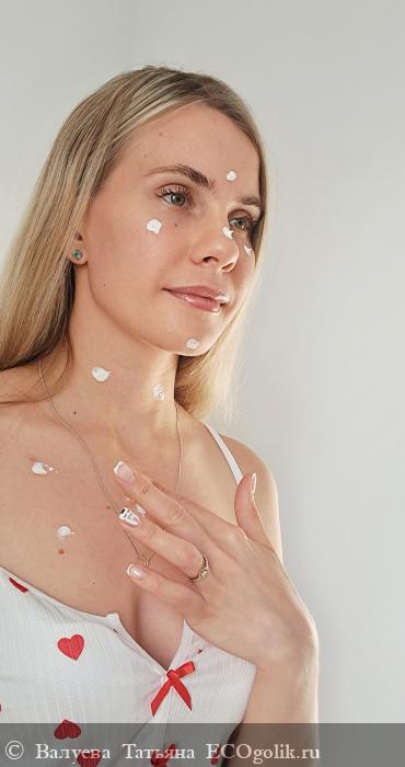 Крем легко распределяется по коже и быстро впитывается, оставляя после себя ощущение бархатистой мягкости. Уже спустя несколько минут после нанесения кожа выглядит увлажнённой и сияющей, но при этом не ощущается тяжесть или липкость. Это особенно важно для обладателей чувствительной и комбинированной кожи