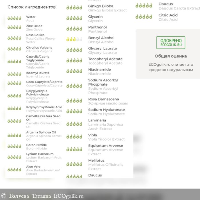 Содержит минеральный УФ-фильтр - оксид цинка, обеспечивающий UVA и UVB защиту кожи, а также увлажняющие, успокаивающие и омолаживающие активы. В составе - только натуральные и безопасные компоненты.