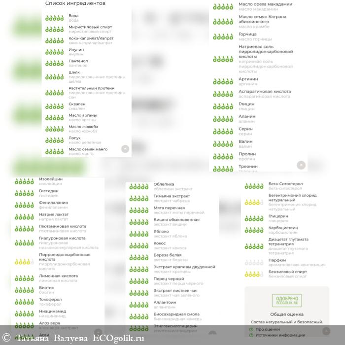 Вода, миристиловый спирт, коко-каприлат/капрат, инулин, пантенол, гидролизованные протеины шёлка, гидролизованные протеины пшеницы, гидролизованные протеины сои, сквален, масло арганы, масло жожоба, масло репейное, масло манго, масло макадамии, масло крамбе, масло горчицы, натриевая соль пирролидонкарбоновой кислоты, аргинин, аспарагиновая кислота, глицин, аланин, серин, валин, пролин, треонин, изолейцин, гистидин, фенилаланин, натрия лактат, глютаминовая кислота, гиалуроновая высокомолекулярная кислота, гиалуроновая низкомолекулярная кислота, пирролидонкарбоновая кислота, лимонная кислота, биотин, токоферол, ниацинамид, алоэ вера экстракт, экстракт асаи, облепихи экстракт, экстракт чабреца, экстракт мяты перечной, экстракт вишни, экстракт яблока, экстракт кокоса, экстракт березы, экстракт крапивы, экстракт перца чёрного, экстракт чая зелёного, аллантоин, биосахаридная камедь, этилгексилглицерин, бета-ситостерол, бегентримония хлорид натуральный, глицерин, карбоцистеин, диацетат глутамата тетранатрия, ароматическая композиция, бензиловый спирт